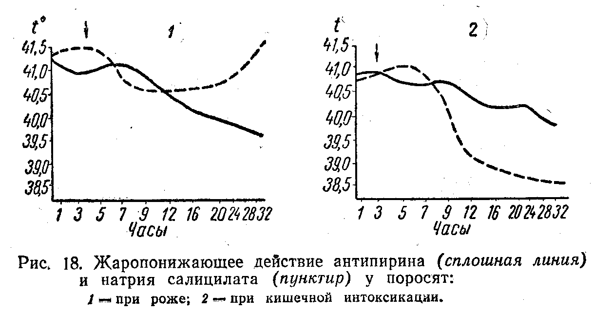Белый кристаллический порошок горького вкуса, растворимый в воде и спирте. Стойкий при хранении, не изменяется при стерилизации растворов кипячением. Хранят под замком (список А), в хорошо закупоренных банках и ампула х . Кроме порошка, выпускают в ампулах ( 1° /о-н ы й по 1 мл) и в форме таблеток (по 0,025). Действует аналогично морфину, но имеет и целый ряд особенностей. Он ослабляет восприятие центральной нервной системой болевых импульсов, усиливает действие местноанестезирующих веществ, влияет снотворно. Промедол менее токсичен, чем морфин, незначительно угнетает дыхательный центр, усиливает сокращения матки. Отмечено, что промедол ослабляет моторную функцию кишечника, но меньше, чем морфин. Анальгезирующее действие, весьма сильно выраженное, наступает через 10—20 мин и длится 2—6 ч. Промедол сокращает сфинктеры пищеварительного тракта, но слабее, чем морфин. Дозы под кожу: лошадям 0,015—0,05 г; коровам 0,004—0,008; собакам 0,003 г. Сходно с промедолом влияют фенадон (Phenadonurn) и пальфиум (Palfium). ЖАРОПОНИЖАЮЩИЕ И АНАЛЬГЕТИЧЕСКИЕ ВЕЩЕСТВА ИЗ ПРОИЗВОДНЫХ АНИЛИНА, ПИРАЗОЛОНА И САЛИЦИЛОВОЙ КИСЛОТЫ Причин лихорадки очень много. Ими являются токсины микробного и протозойного происхождения, токсические вещества недоброкачественного корма, продукты воспаления и др. Все лекарственные вещества, устраняющие эти нарушения (химиотерапевтические.противо-токсические, противовоспалительные и др.), при определенных условиях будут самыми действенными и самыми ценными жаропонижающими средствами. Но при многих заболеваниях высокая температура держится несколько дней; она изнуряет и истощает организм, а при различных осложнениях может быть и губительной. Поэтому, хотя основное врачебное вмешательство и направляется на устранение причины, вызывающей болезнь и как симптом ее—лихорадку, в случаях, когда этого достигнуть нельзя ,, необходимо давать организму отдых от чрезмерного напряжения, назначая специальные антипиретики (Anti-pyretica). Это тем более необходимо потому, что при наличии в организме токсических веществ чувствительность центра теплорегуляции обычно повышается. Механизм противолихорадочного действия разных жаропонижающих веществ весьма различен, но во всех случаях итогом действия является восстановление влияния центра теплорегуляции. Это рефлекторно (через центры вегетативных нервов) ведет к понижению теплопродукции, а также к расширению кожных сосудов и тем самым к усилению теплоотдачи: некоторые антипиретики действуют и непосредственно на сосуды, расширяя их. В больших до.зах антипиретики угнетают центр теплорегуляции и всю центральную нервную систему. Большая группа противолихорадочных средств (препараты салициловой кислоты), кроме влияния на центр теплорегуляции, действует антитоксически и бактериостатически, тем самым содействует устранению причины, вызывающей лихорадку. Наряду с жаропонижающим действием все антипиретики в той или иной степени являются а н альгетикам и, угнетая возбужденные болевые центры подобно тому, как и центр теплорегуляции, а также понижая чувствительность периферических рецепторов. В отличие от анальгетиков типа морфина эти вещества иногда называют противоболевыми или а н тиальгическим и. При повторных приемах антипиретиков их лечебное действие (особенно анальгетическое) проявляется слабее, а т