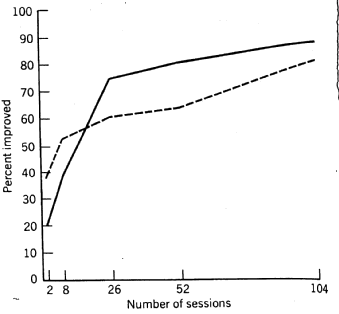 Если психотерапия является эффективной, то изменения, вызываемые ею, должны быть более значительными, чем те, которые могут возникнуть сами по себе – так называемая спонтанная ремиссия. Это тот самый вопрос, который поднял Айзенк еще в 1952 г., поставил под сомнение саму ценность психотерапии как вида лечения [11]. Этоn вывод послужил стимулом к развертыванию множества исследований, в ходе которых постепенно вырабатывалась современная методология изучения эффективности психотерапии. К сожалению, в большинстве ранних эмпирических работ не применялась, например, такая методология исследований, согласно которой в случайном порядке одних пациентов распределяют в группу тех, кто будет получать психотерапевтическое лечение, а других – в контрольную группу. В результате оказывается невозможным достоверно сравнить состояние пациентов, проходивших и не проходивших лечение. Последовавшие после сенсационной работы Айзенка исследования, основанные на мета-анализе той же литературы, которую использовал он, а также и других источников, свидетельствует о том, что реальные показатели улучшения в отсутствие психотерапии были существенно ниже, чем указывает Айзенк. Исследования А.Бергина и М.Ламберта, например, показали, что величина спонтанной ремиссии у невротических пациентов равняется приблизительно 40% [4]. В другом исследовании [21], проведенном на материале мета-анализа отдельных работ, в которых в сумме представлены данные по 2431 пациенту, собранные в течение 30 лет, была выявлена стабильная закономерность, отражающая взаимосвязь между количеством психотерапевтических сеансов, полученных пациентом, и степенью улучшения его состояния (см. рис.1).
