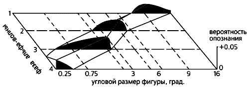 Зависимость вероятности (отложена по вертикали) опознания геометрических фигур разного размера от момента их предъявления, т.е. от фазы альфа-волны. При хаотическом предъявлении в контрольных опытах эта вероятность одинакова и принята за ноль (координатная плоскость). Видно, что распознавание более крупных фигур улучшается по сравнению с контролем, если они предъявляются на ранних фазах альфа-ритма, а более мелких — на поздних фазах.