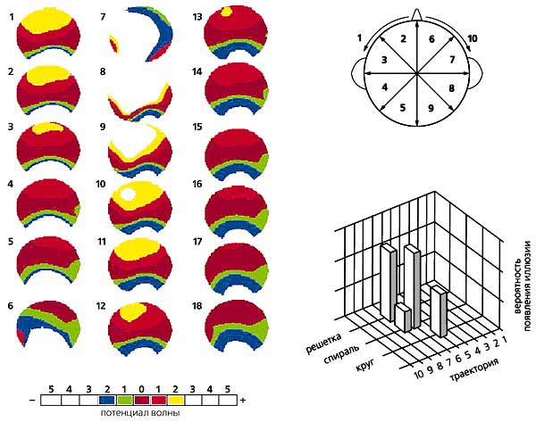 Во-первых, на серии динамических карт, отражающих волну, которая двигалась от затылка ко лбу, мы увидели, что отрицательный полюс потенциала, находящийся в затылочной области коры, распространяется в том же направлении [8]. Во-вторых, удалось выявить, что конкретные иллюзии возникали на фоне определенной траектории волны. Например, круг и спираль появлялись в том случае, если волна двигалась от затылка ко лбу, а решетка — при траектории, направленной от левой затылочной области коры к правой лобной. Следовательно, связь между видом иллюзии и направлением движения альфа-волны существует.