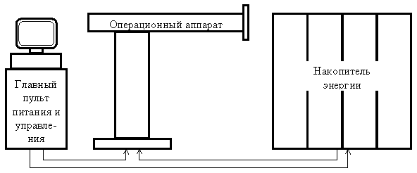 Оглавление Введение Структурная схема Функциональная схема Принцип действия Основные параметры и характеристики Выводы Список литературы Оглавление В настоящее время лазерное излучение с большим или меньшим успехом применяется в различных областях науки. Уникальные свойства излучения лазеров, такие, как монохроматичность, когерентность, малая расходимость и возможность при фокусировке получать очень высокую плотность мощности на облучаемой поверхности обеспечили широкое применение лазеров. Использование квантовой электроники оказалось, в частности, очень полезным для клинической медицины. В медицинских целях используются, в основном, твердотельные и газовые лазеры. Импульсные твердотельные лазеры применяют преимущественно в офтальмологии для операций по устранению отслоения сетчатки глаза и при лечении глаукомы. Для этих целей была разработана специальная аппаратура с использованием неодимовых и рубиновых лазеров. Для операций с рассечением тканей импульсные лазеры оказались непригодны, поэтому для этих целей применяют лазеры непрерывного действия. В Советском Союзе была создана хирургическая аппаратура на СО 2 лазерах. Такие хирургические установки применяют в общей хирургии, онкологии и других областях. Установками на основе аргоновых лазеров непрерывного действия с использованием специальных световодов пользуются медики при внутриполостных операциях. В терапии разных болезней широко применяются газовые гелий-неоновые лазеры. Например, положительные результаты получены при лечении трофических язв, ран, воспалительных процессов, некоторых сосудистых заболеваний и в кардиологии. Не вызывает сомнения стимулирующее действие излучения гелий-неоновых лазеров при регенерации и улучшении обменных процессов. Основными преимуществами, стимулирующими применение лазеров в медицине, являются радикальность лечения, снижение сроков вмешательства, уменьшение числа осложнений, кровопотери, улучшение условий стерильности и т. д. Лазерная медицинская установка "Импульс-1" — первый отечественный аппарат, созданный и разработанный для ведения лазеротерапии в соответствии с медико-техническим требованием Министерства здравоохранения СССР. Разработка установки была закончена в 1971 году. В том же году Комитет по новой медицинской технике Минздрава СССР дал рекомендацию к выпуску промышленной партии этих установок, которая и была изготовлена в 1975 году на Свердловском заводе электромедицинской аппаратуры. Установка "Импульс-1" разработана на базе специально созданного для нее мощного импульсного лазера на неодимовом стекле. Установка (см. рис. 1) состоит из следующих основных частей: операционного аппарата, накопителя энергии и главного пульта питания и управления.