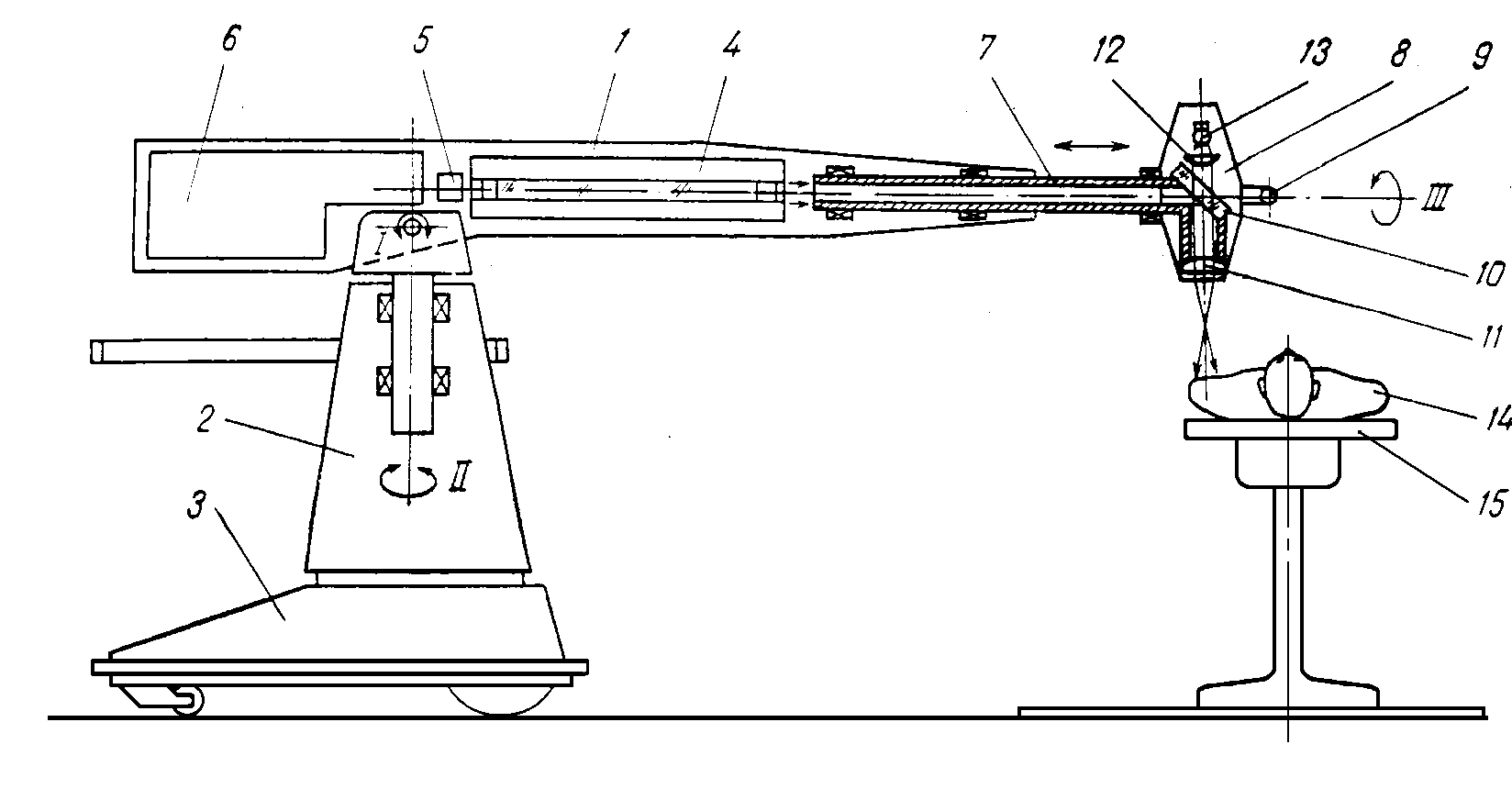 Конструктивная схема операционного аппарата установки приведена на рисунке 2. Операционный аппарат состоит из горизонтального ствола 1, установленного на вертикальной стойке 2 . Ствол может поворачиваться вокруг горизонтальной оси I и вертикальной оси II . Вертикальная стойка 2 жестко закреплена на платформе 3 . Платформа снабжена колесами для перемещения аппарата по полу. К вертикальной стойке прикреплен поручень. Внутри ствола 1 жестко закреплены лазерный излучатель 4 , калориметрический блок 5 и блок поджига 6 . На конец ствола 1 установлен телескопический вал 7 с поворотно-фокусирующей головкой 8 . Телескопический вал 7 можно перемещать вдоль его собственной оси симметрии III и поворачивать вокруг той же оси III вместе с поворотно-фокусирующей головкой 8 . Головка 8 жестко закреплена на конце телескопического вала. На нем жестко закреплена и рукоятка 9 , охватывающая поворотно-фокусирующую головку 8 . Внутри головки 8 жестко зафиксированы селективно отражающее лазерное излучение зеркало 10 , фокусирующая линза 11 , конденсор 12 и лампочка накаливания 13 . Лазерный излучатель 4 выполнен в виде отдельного блока. Активным элементом в нем является стержень из неодимового стекла ПГЛС-1 диаметром 45 мм и длиной 617 мм. Активный элемент возбуждается с помощью четырех ксеноновых ламп накачки ИПФ-20000, расположенных в четырехлепестковом осветителе с четырьмя V-образными отражателями, изготовленными из нержавеющей стали. Внутренние поверхности отражателей полированные и имеют хорошо отражающее серебряное покрытие. Активный элемент расположен в корпусе осветителя вдоль оси симметрии. Корпус осветителя изготовлен из нержавеющей стали. Торцы активного элемента уплотнены в корпусе осветителя с помощью индиевых колец, сжимаемых цилиндрическими держателями зеркал резонатора. Глухое и полупрозрачное зеркала, установленные параллельно торцам активного элемента, герметизирует полости между зеркалом и активным элементом. При этом боковыми стенками полостей являются цилиндрические поверхности держателей зеркал резонатора. Внутренняя полость осветителя, лампы накачки и активный элемент омываются 0.02% раствором K 2 Cr 2 O 4 в дистиллированной воде, циркулирующей через осветитель. Полупрозрачное зеркало резонатора (коэффициент пропускания 60%) установлено в излучателе 4 со стороны поворотно-фокусирующей головки 8 . Глухое зеркало резонатора с коэффициентом пропускания 5% размещено со стороны калориметрического блока 5 . Поэтому при генерации лазерного излучения в резонаторе излучателя 4 основная часть излучения направлена в сторону поворотно-фокусирующей головки, а остальная — в сторону калориметрического блока 5 , где поглощается его приемной площадкой. Калориметрический блок 5 (после проведения соответствующей калибровки) обеспечивает измерение энергии лазерного излучения, направляемой в сторону поворотно-фокусирующей головки, по поглощенной его приемной площадкой энергии лазерного излучения. Блок поджига 6 четырехсекционный. Каждая его секция предназначена для поджига одной из ламп накачки лазерного излучателя. Регулирование размеров пятен лазерного излучения на объекте облучения осуществляется в операционном аппарате изменением расстояния между линзой 11 поворотно-фокусирующей головки и объектом облучения, а контроль размеров пят