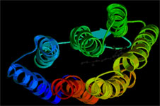 Рис.2. Схематическая модель трехмерной (пространственной) структуры БР (PDB Index 1FBB). Семь a-спиралей формируют хромофорную полость и трансмембранный канал переноса протона.