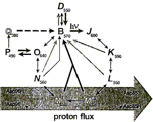 БР локализован в участках клеточных мембран H. salinarum в виде пурпурных мембран (ПМ), образующих двумерные кристаллы с гексагональной решеткой. Эти участки содержат сам белок, некоторые липиды, каротиноиды и воду (рис.3). Обычно они имеют овальную или круглую форму со средним диаметром около 0,5 мкм и содержат около 25 % липидов и 75 % белка (Oesterhelt D., Stoeckenius W., 1974). ПМ устойчивы к солнечному свету, воздействию кислорода, температуре более чем 80ºC (в воде) и до 140ºC (сухие), рН от 0 до 12, высокой ионной силе (3 М NaCl), действию большинства протеаз, чувствительны к смесям полярных органических растворителей с водой, но устойчивы к неполярным растворителям типа гексана. Большое практическое значение имеет существующая возможность встраивания ПМ в полимерные матрицы без потери фотохимических свойств. Индуцированный светом протонный транспорт сопровождается рядом циклических спектральных изменений БР, совокупность которых называется фотоциклом (рис.4). Тридцать лет исследований привели к довольно детальному пониманию фотоцикла, однако подробности протонного транспорта все еще изучаются. Фотохимический цикл БР состоит из отдельных интермедиатов, которые могут быть идентифицированы как максимумами поглощения, так и кинетикой образования и распада. На рис.4 показана упрощенная модель фотоцикла БР (Hampp N., 2000).