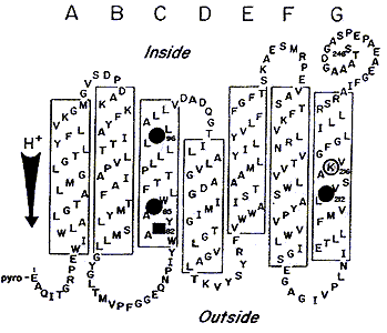 Рис.1. Модель БР в элементах вторичной структуры. Выделены аминокислоты, участвующие в протонном транспорте: кружками остатки аспарагиновой кислоты, квадратом остаток аргинина. С Lys-216 (К-216) образуется основание Шиффа (SB). Стрелкой показано направление протонного транспорта.
